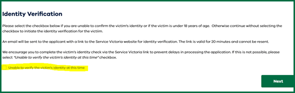 Authorised representatives have the option of bypassing the applicant’s identity verification by selecting the ‘unable to verify the victim’s identity at this time’ box within the identity verification module in the FAS application.